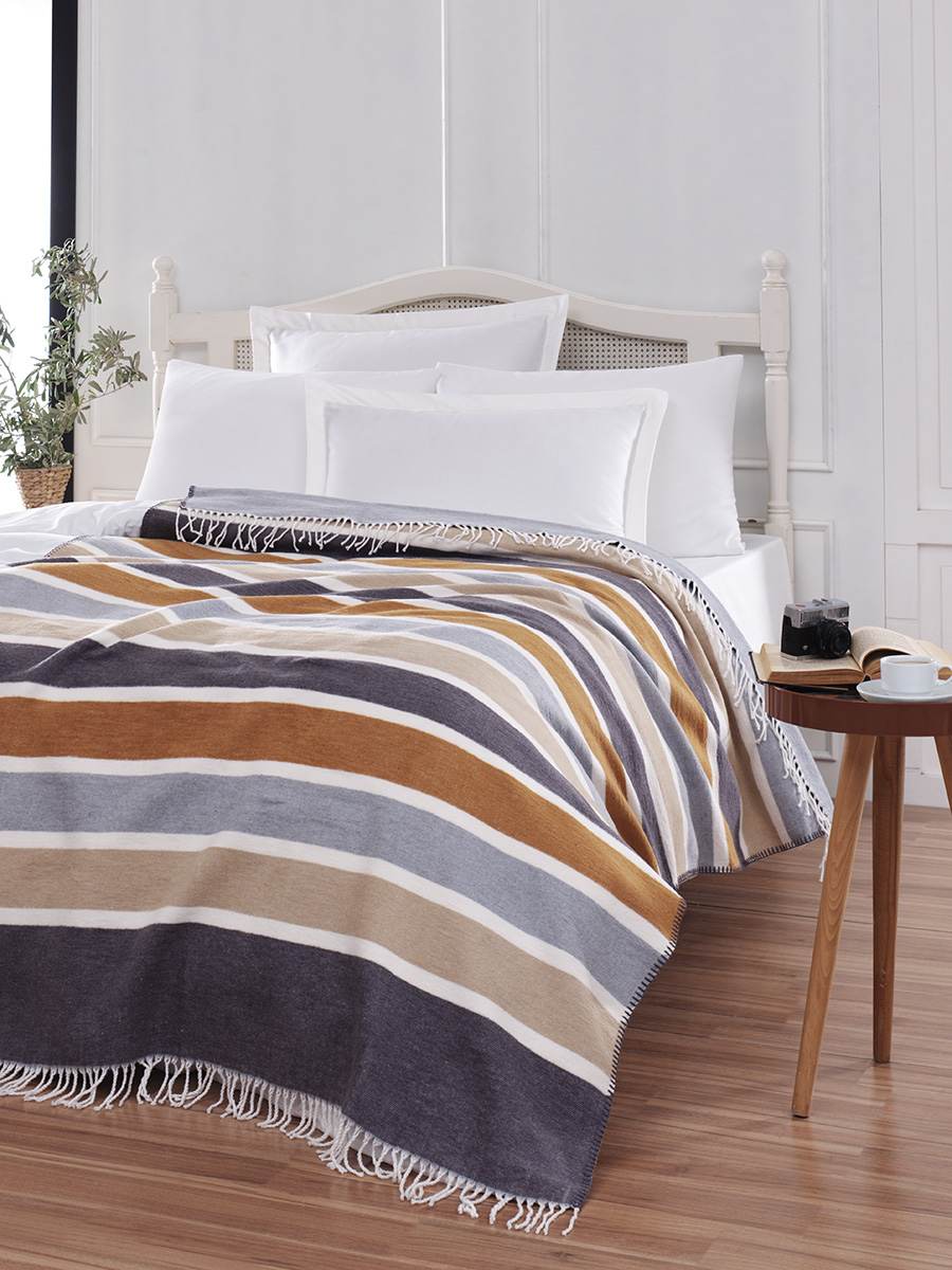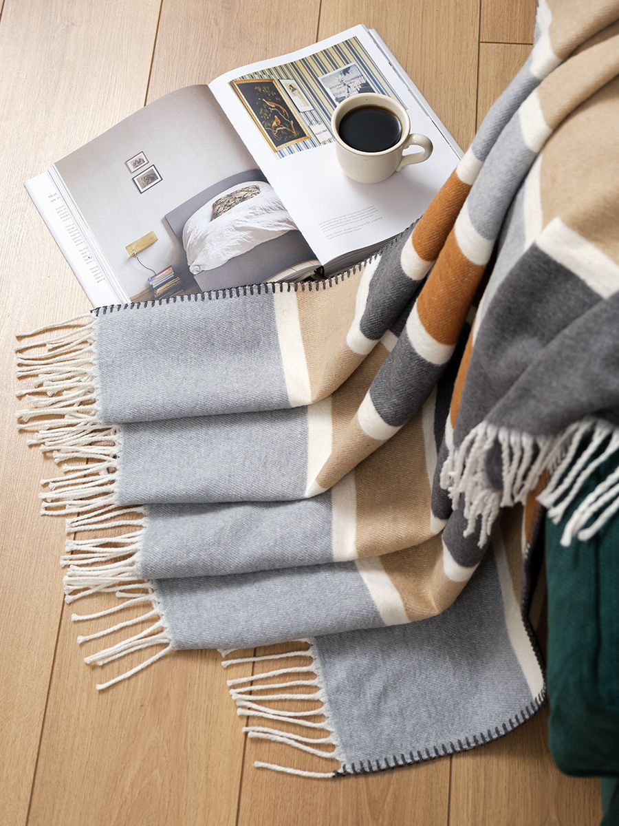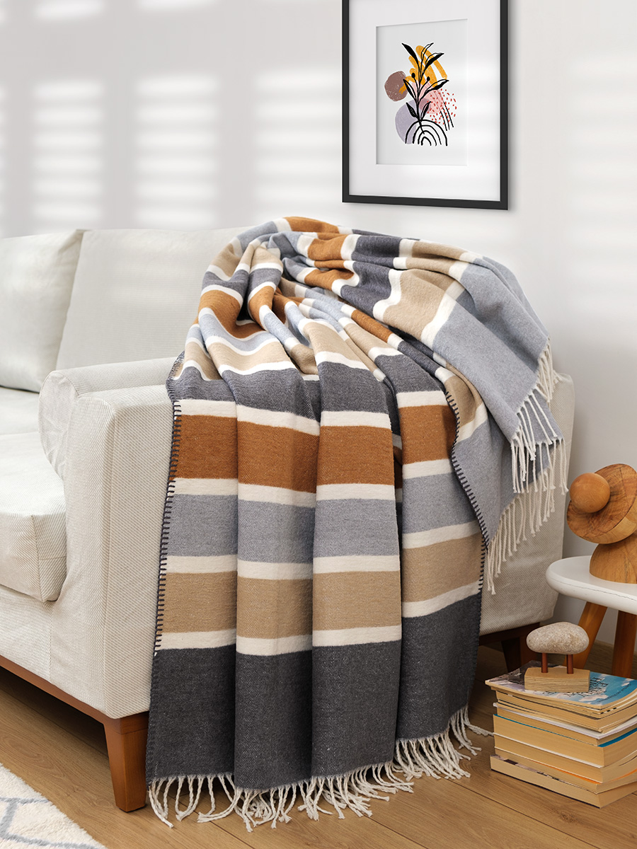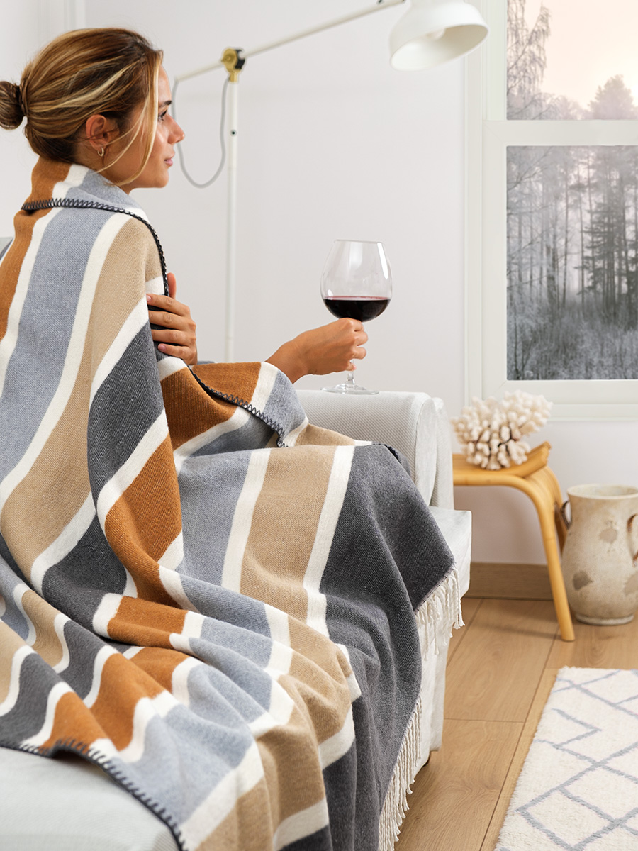 - Efektowna dekoracja: Duża powierzchnia koca pozwala na piękne wyeksponowanie jego faktury i ozdobnych frędzli na dużej kanapie narożnej.