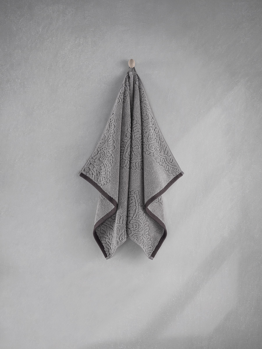 Ręcznik bawełniany VANCE to synonim luksusu i wyrafinowanego gustu, zaprojektowany z myślą o niezwykłych, codziennych doznaniach. Jego wyjątkowość tkwi w kunsztownym, głęboko tłoczonym wzorze, który tworzy na powierzchni tkaniny trójwymiarową, żakardową strukturę. Bogata ornamentyka, inspirowana pałacowym zdobnictwem, sprawia, że ręcznik staje się nie tylko praktycznym dodatkiem, ale prawdziwą, elegancką ozdobą łazienki.Wykonanie ze 100% starannie wyselekcjonowanej bawełny premium gwarantuje aksamitną miękkość i jest niezwykle delikatne dla skóry. Wysoka gramatura 520 g/m² zapewnia uczucie przyjemnego otulenia, wyjątkową puszystość oraz błyskawiczną chłonność, skutecznie osuszając ciało. To idealny wybór dla tych, którzy nie akceptują kompromisów między funkcjonalnością a wyszukaną estetyką, pragnąc nadać swojemu wnętrzu prestiżowy charakter.