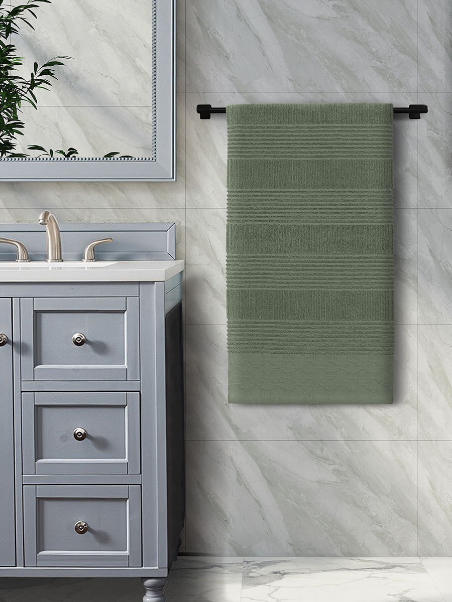 Jego wyjątkowy charakter podkreślają eleganckie żakardowe zdobienia. Ten misternie utkany wzór jest niezwykle trwały i dodaje ręcznikowi szlachetnego wyglądu, czyniąc go stylowym dopełnieniem każdej łazienki. To wybór dla tych, którzy cenią sobie połączenie funkcjonalności z wyrafinowanym designem.