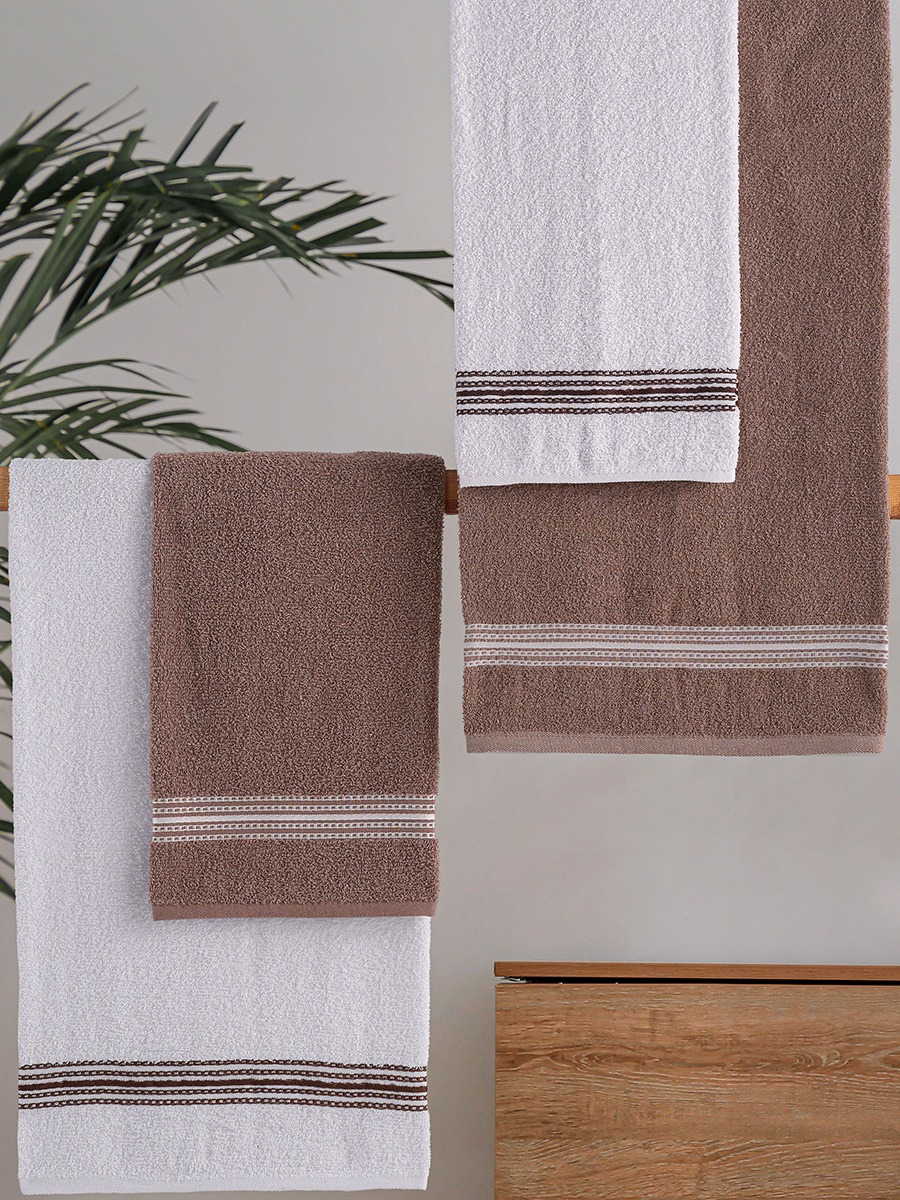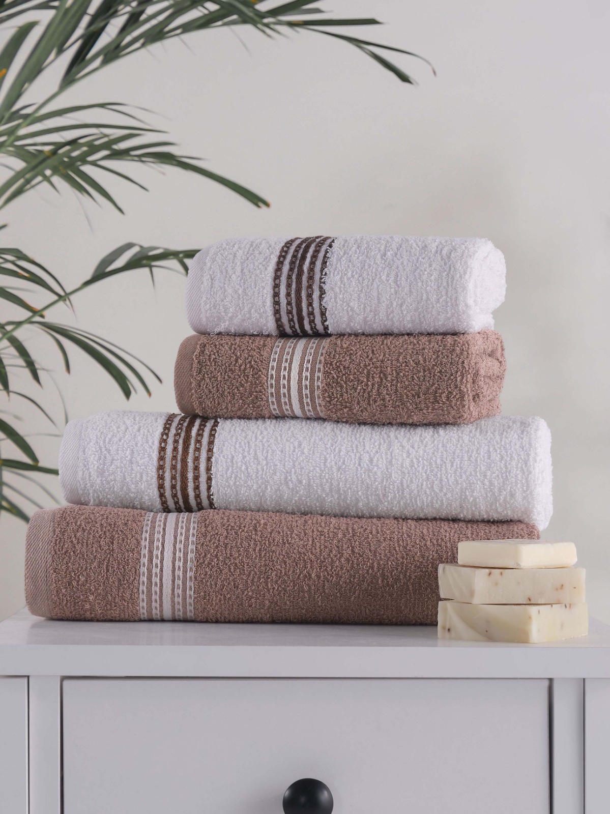 Prezentowany zestaw składa się z 4 ręczników: 2 x 50x90 cm + 2 x 70 x 140 cm