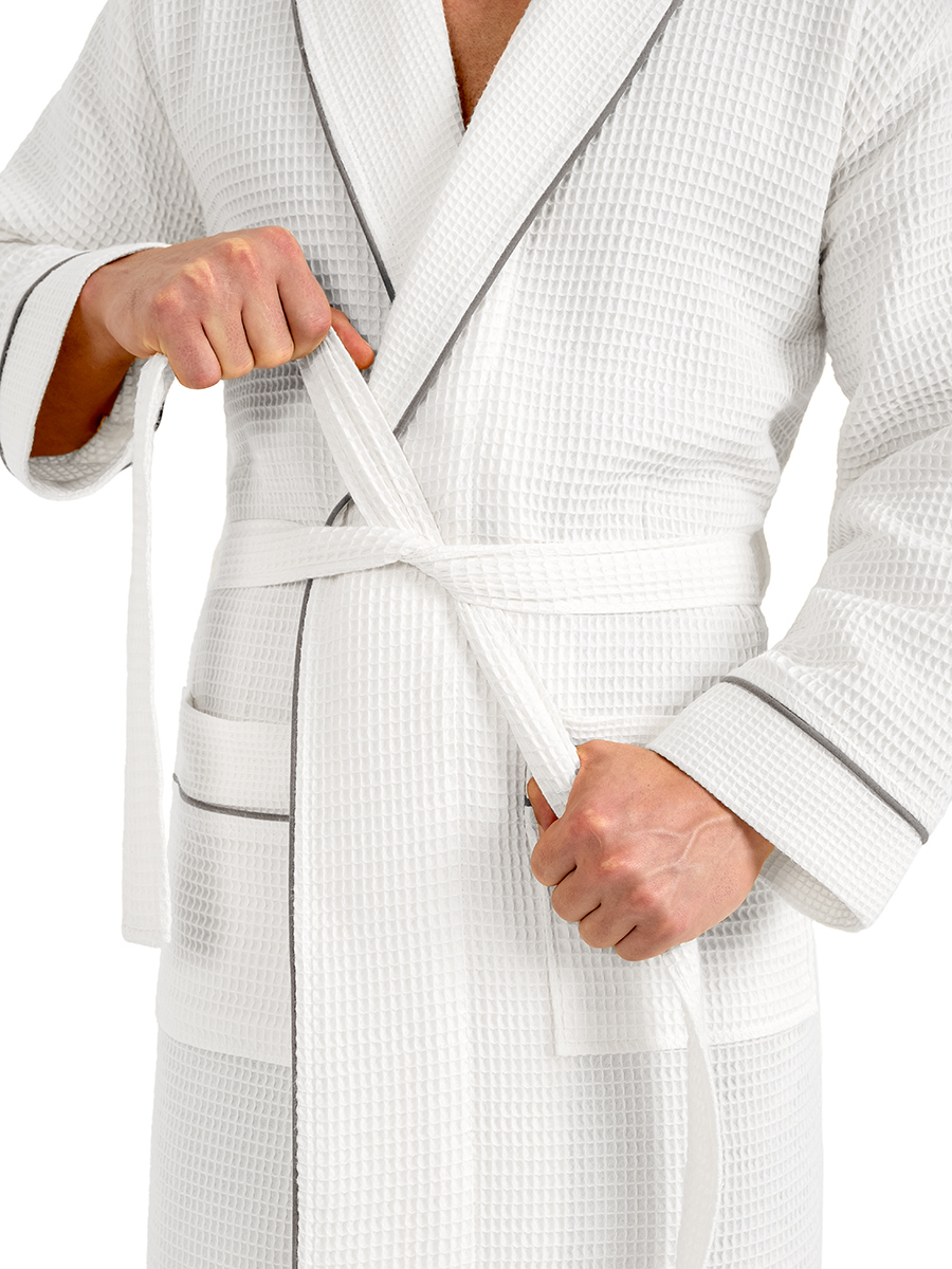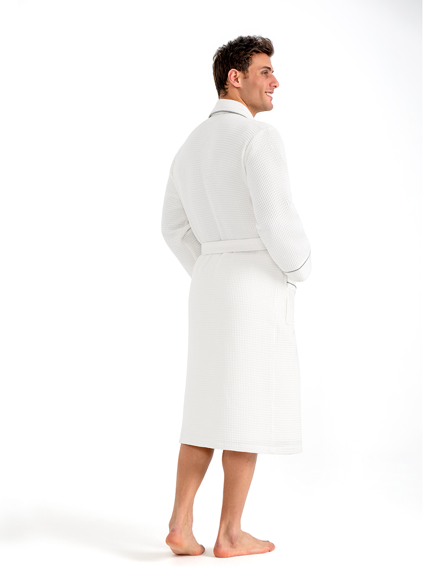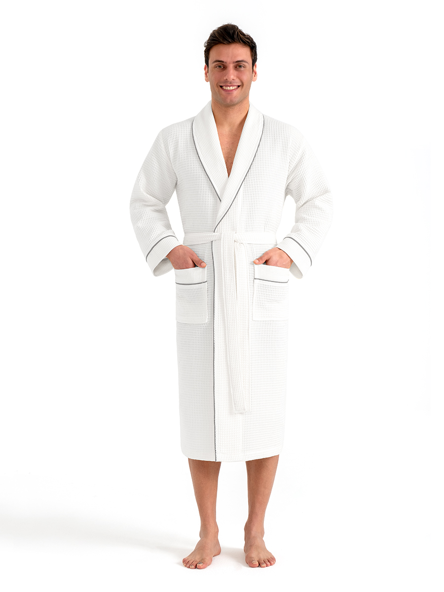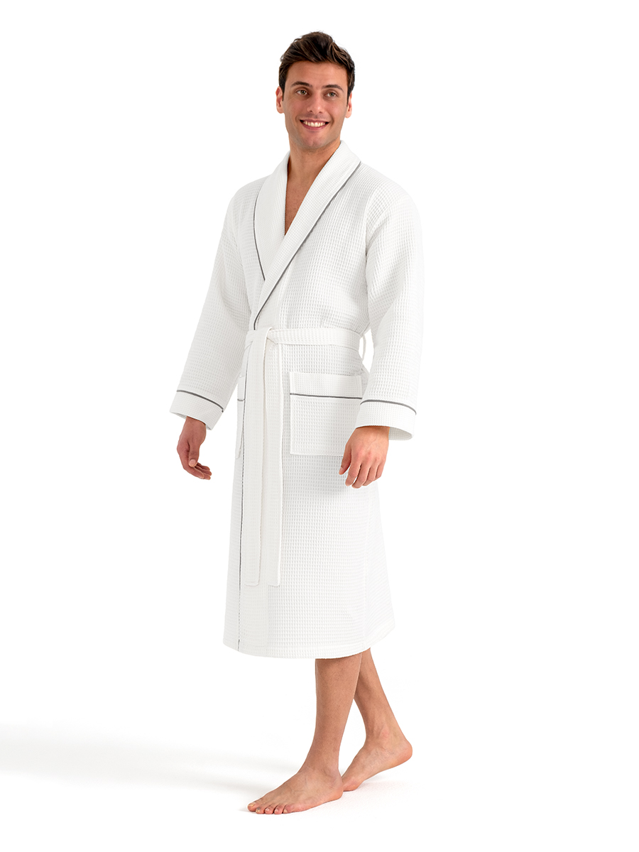 Oferujemy elegancki szlafrok waflowy męski w kolorze białym, który łączy w sobie komfort, funkcjonalność i ponadczasowy styl. Wykonany w 100% z wysokiej jakości bawełny, szlafrok zapewnia przyjemność noszenia dzięki doskonałej oddychalności materiału. Gramatura 240g/m² gwarantuje optymalną grubość, co sprawia, że jest idealnym wyborem zarówno po kąpieli, jak i na poranne chwile relaksu.