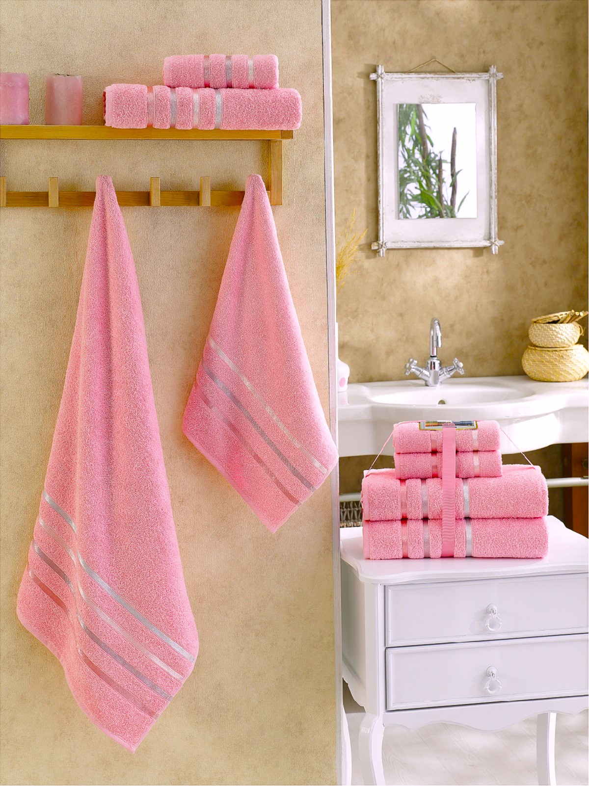 Zestaw składa się z czterech ręczników, po dwie sztuki o rozmiarach 50x80cm i 70x140cm