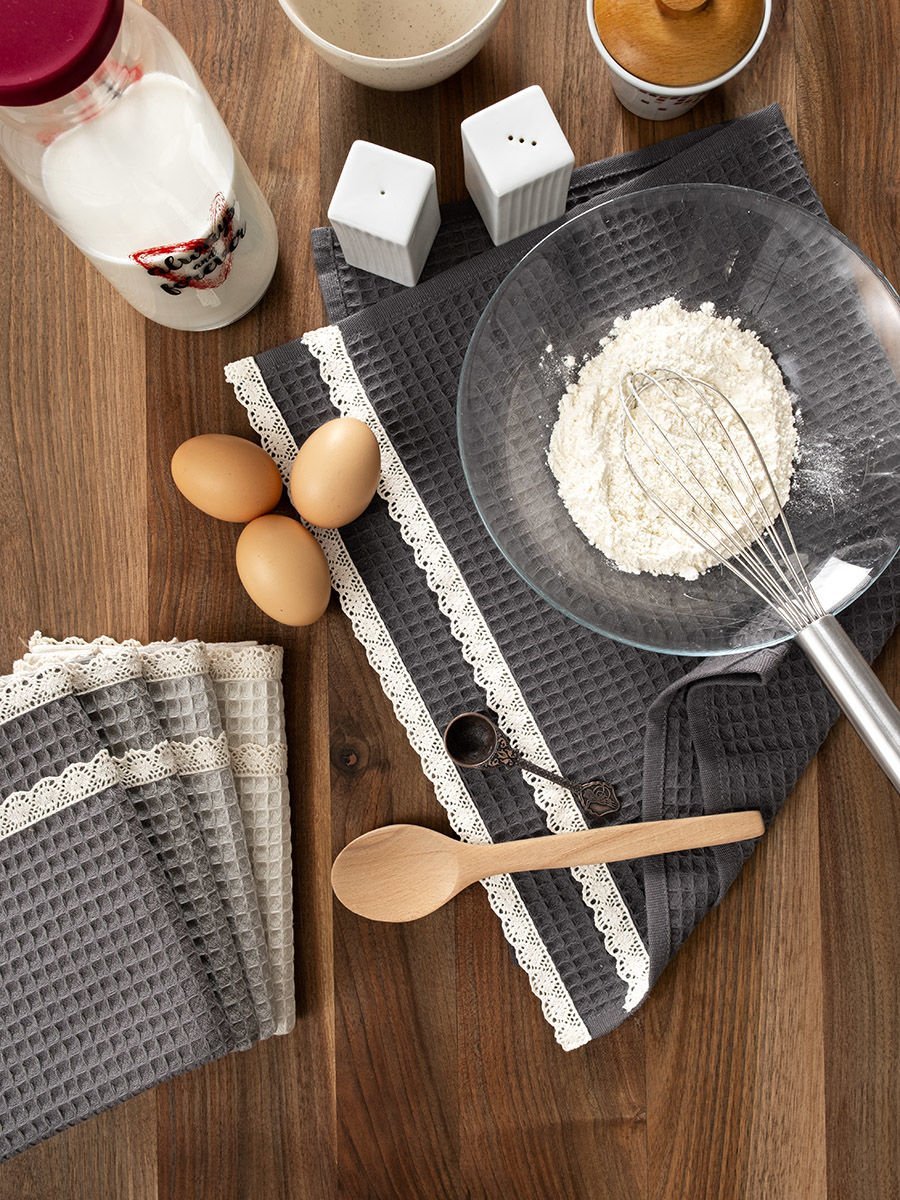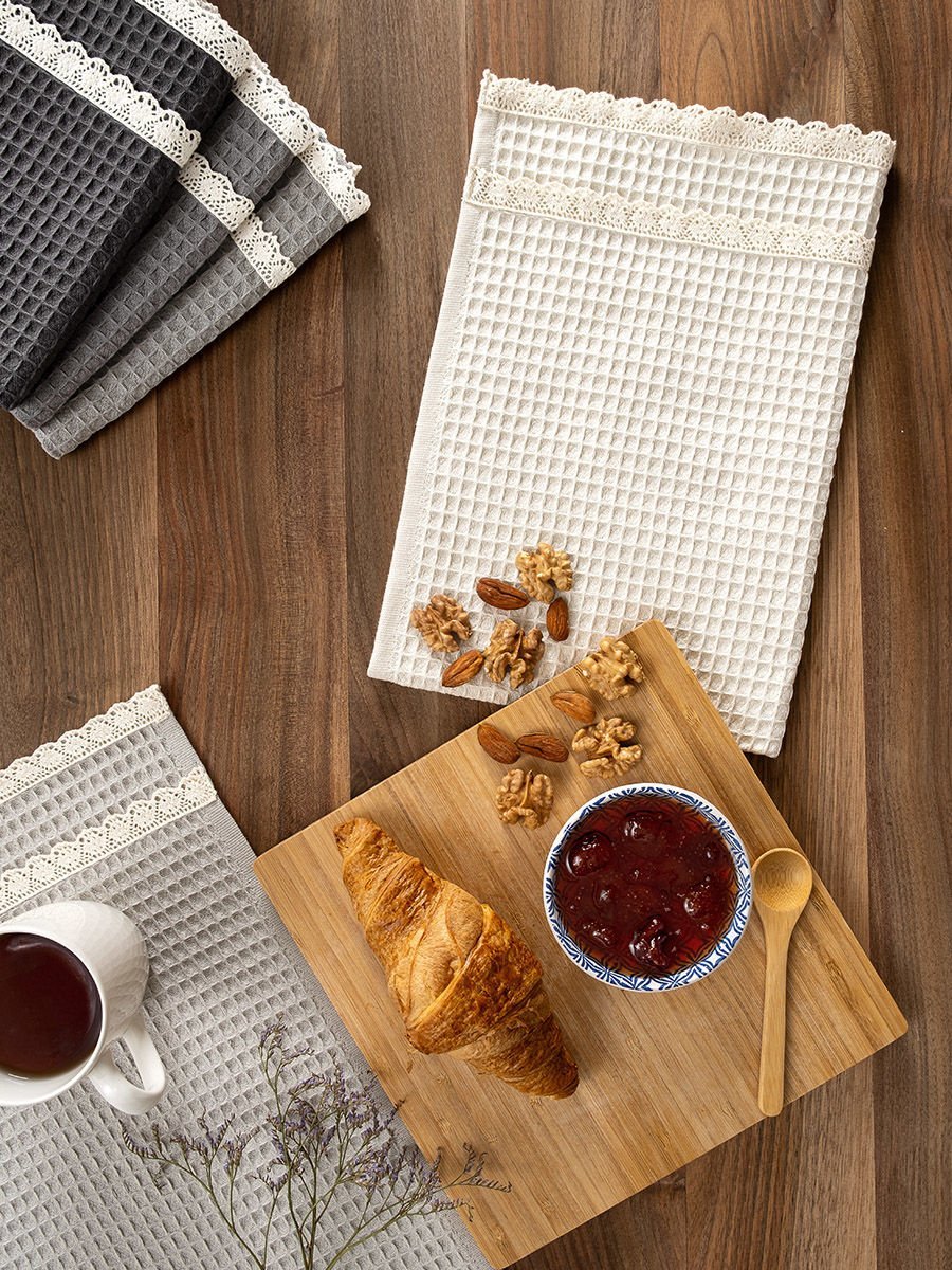 Ściereczki waflowe z gipiurą to nie tylko praktyczne narzędzia do codziennego sprzątania, ale także eleganckie dodatki do wnętrza. Ich subtelną, ozdobną krawędzią w postaci gipiury ożywisz swoją kuchnię czy łazienkę.